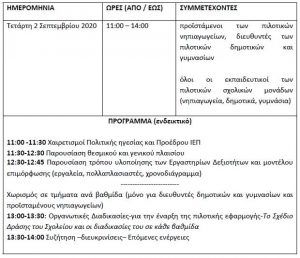 - μέχρι 31/8/2020 και ώρα 14.00 (προϊστάμενοι νηπιαγωγείων και διευθυντές δημοτικών και γυμνασίων των πιλοτικών σχολικών μονάδων)