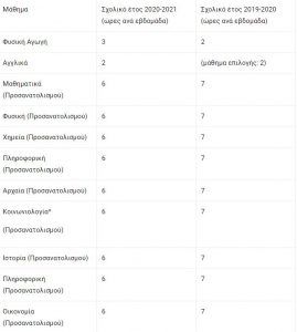 Καταργούνται τα μαθήματα: Ερευνητικές Δραστηριότητες, Γεωλογία και Διαχείριση Φυσικών Πόρων, Ελληνικός και Ευρωπαϊκός Πολιτισμός και Καλλιτεχνική Παιδείας. (Τα τρία τελευταία ήταν μαθήματα επιλογής). Γίνονται υποχρεωτικά μαθήματα η Πληροφορική και τα Αγγλικά.