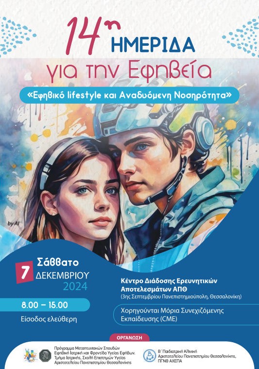14η Ημερίδα για την Εφηβεία, η οποία θα πραγματοποιηθεί το Σάββατο 7 Δεκεμβρίου 2024 ώρες 08.00 -15.00 στο Κέντρο Διάδοσης Ερευνητικών Αποτελεσμάτων (ΚΕΔΕΑ) του ΑΠΘ.