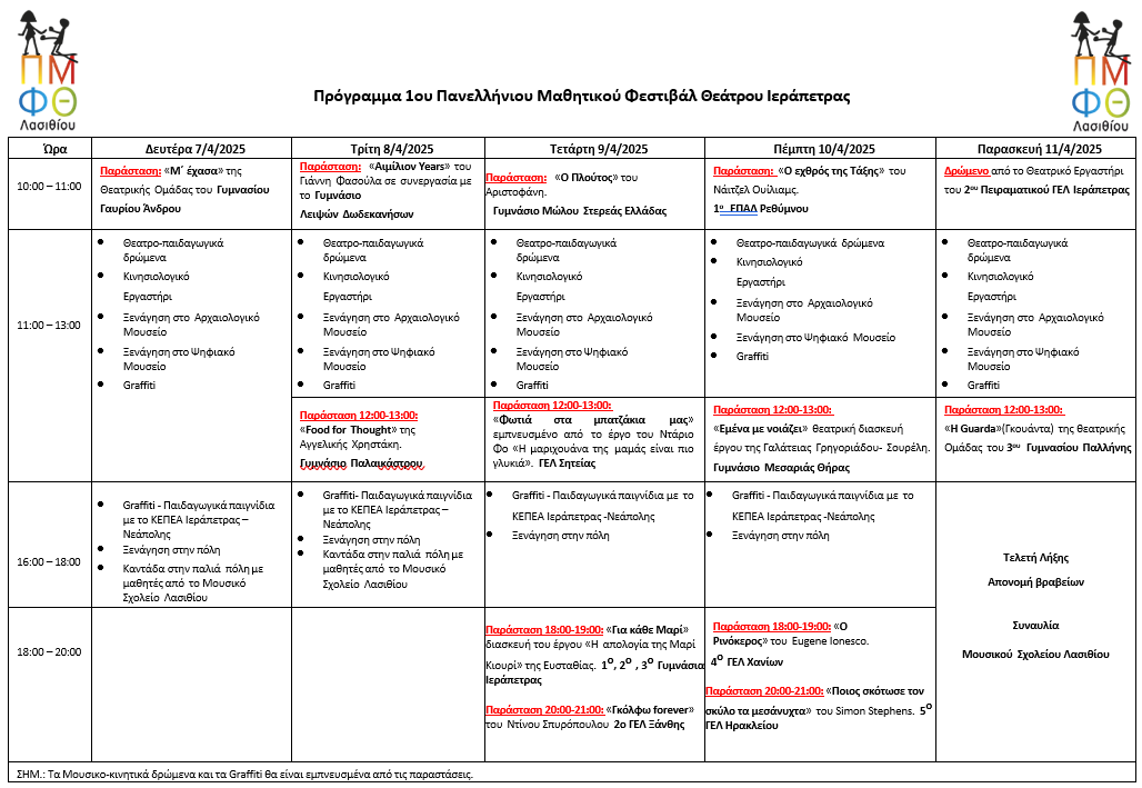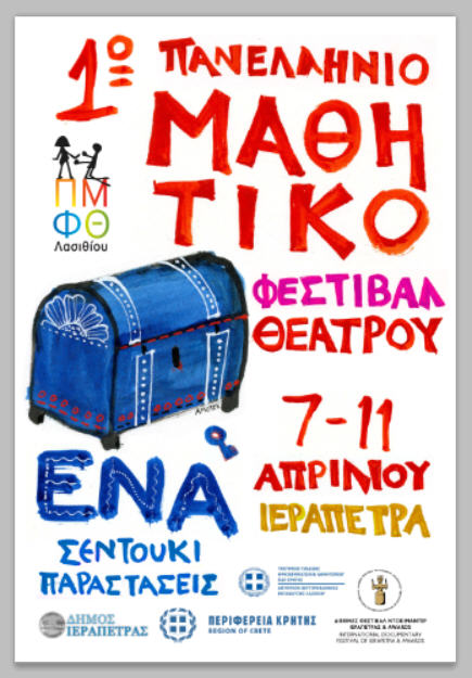 Με καίρια επιδίωξη την ενίσχυση της θεατρικής παιδείας των μαθητ(ρι)ών και την ανάδειξη του Θεάτρου ως μέσου για την πολιτιστική, πολιτική, κοινωνική, ηθικοπνευματική παίδευσή τους και την καλλιέργεια της ενεργούς πολιτειότητας, η Διεύθυνση Δευτεροβάθμιας Εκπαίδευσης Λασιθίου διοργανώνει το 1ο Πανελλήνιο Μαθητικό Φεστιβάλ Θεάτρου, σε συνεργασία με την Περιφέρεια Κρήτης – Περιφερειακή Ενότητα Λασιθίου, τον Δήμο Ιεράπετρας και το Διεθνές Φεστιβάλ Ντοκιμαντέρ Ιεράπετρας & Αwards και με την υποστήριξη και εθελοντική συμμετοχή του Κέντρου Εκπαίδευσης για το Περιβάλλον και την Αειφορία (Κ.Ε.ΠΕ.Α.) Ιεράπετρας-Νεάπολης, του Συλλόγου Φίλων Θεάτρου Ιεράπετρας και των σχολικών κοινοτήτων (εκπαιδευτικών, γονέων και μαθητών).