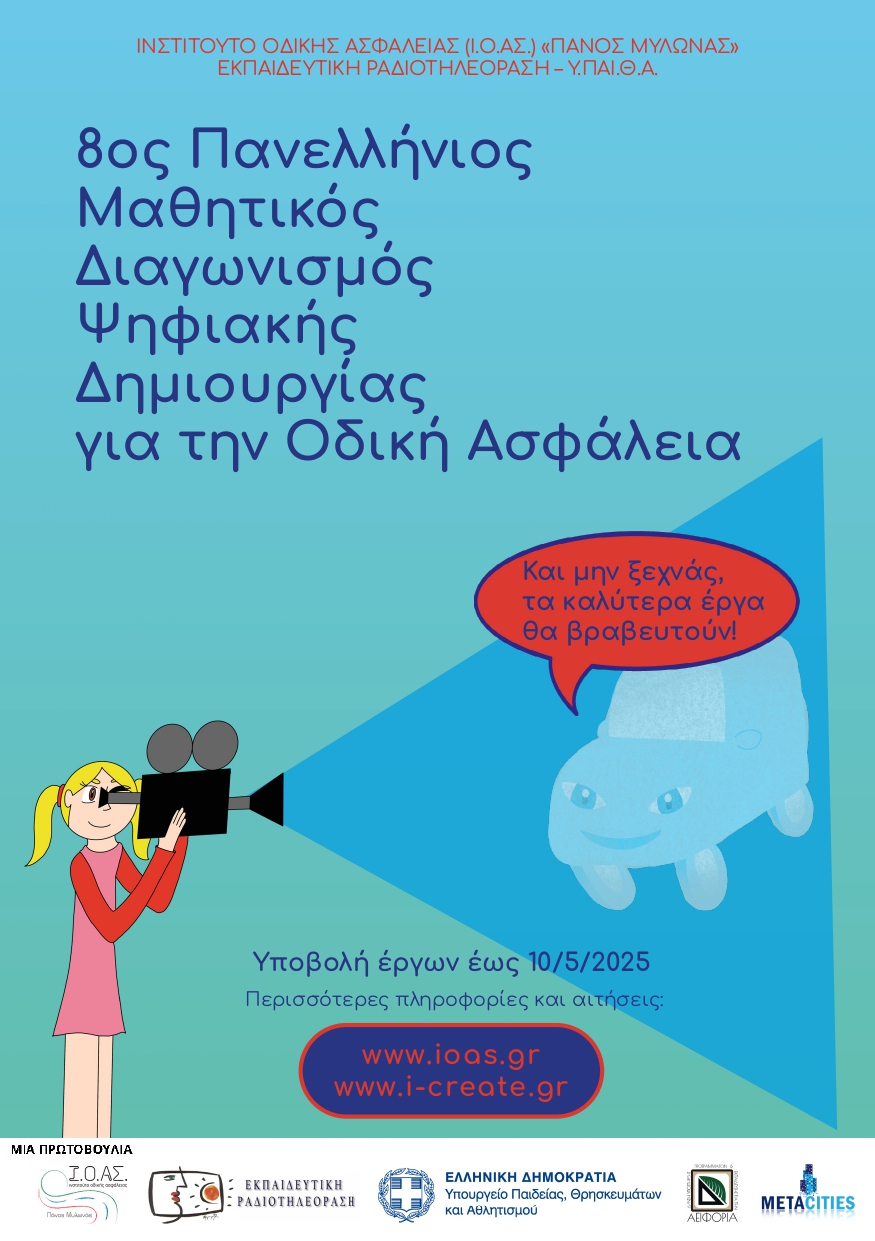 Λαμβάνοντας υπ’ όψη το ενδιαφέρον σας για την Οδική ασφάλεια – έχοντας υλοποιήσει στο σχολείο σας εκπαιδευτικά προγράμματα του Ινστιτούτου Οδικής Ασφάλειας (Ι.Ο.ΑΣ.) «Πάνος Μυλωνάς» – έχουμε τη χαρά να σας καλέσουμε να συμμετάσχετε στον Πανελλήνιο Μαθητικό Διαγωνισμό Ψηφιακής Δημιουργίας, ο οποίος συνδιοργανώνεται για 8η συνεχή χρονιά με το Τμήμα της Εκπαιδευτικής Ραδιοτηλεόρασης και Ψηφιακών Μέσων της Διεύθυνσης Υποστήριξης Προγραμμάτων και Εκπαίδευσης για την Αειφορία του Υπουργείου Παιδείας, Θρησκευμάτων και Αθλητισμού.