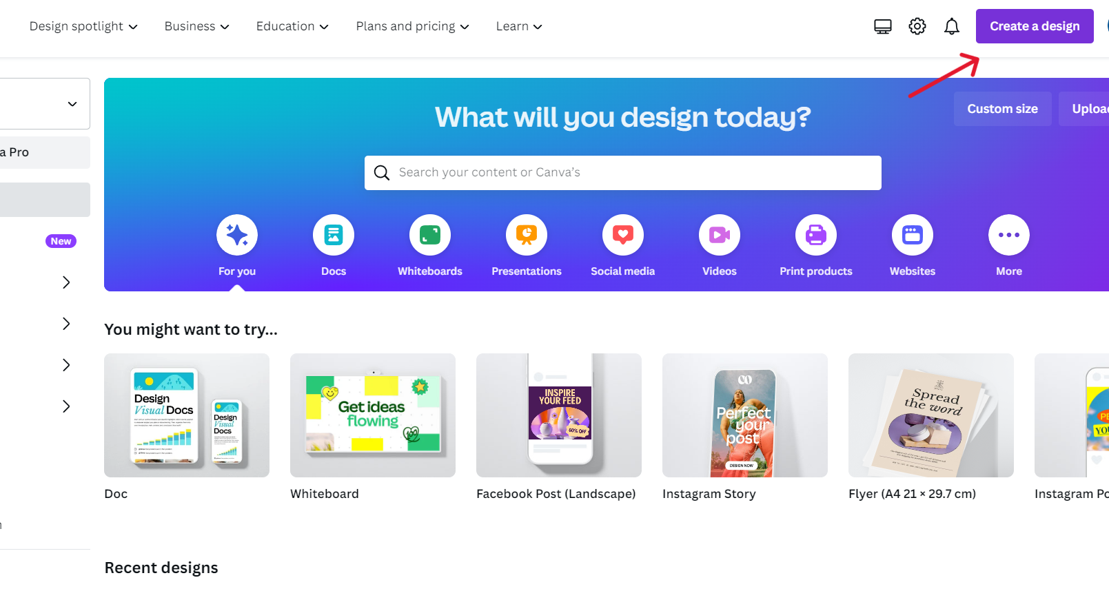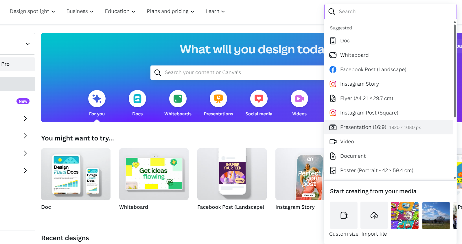 2. Εξερευνήστε το ταμπλό: Εξοικειωθείτε με το ταμπλό του Canva. Εδώ, θα βρείτε επιλογές για τη δημιουργία νέων σχεδίων, την πρόσβαση σε πρότυπα και την προβολή των προηγούμενων σχεδίων σας.