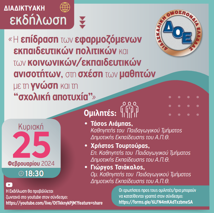 Σε αυτό το πλαίσιο πραγματοποιείται η δεύτερη διαδικτυακή εκδήλωση την Κυριακή 25 Φεβρουαρίου 2024, με τίτλο: Η επίδραση των εφαρμοζόμενων εκπαιδευτικών πολιτικών και των κοινωνικών/εκπαιδευτικών ανισοτήτων, στη σχέση των μαθητών με τη γνώση και τη «σχολική αποτυχία»