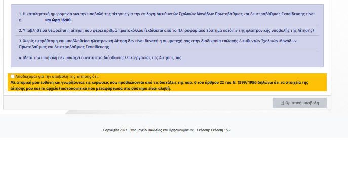 - Στην ηλεκτρονική πλατφόρμα υποβολής των αιτήσεων των υποψηφίων διευθυντών σχολικών μονάδων, οι ενδιαφερόμενοι όφειλαν να δηλώσουν συγκεκριμένες προϋποθέσεις για την υποψηφιότητά τους, σύμφωνα με τις διατάξεις του ν. 4823 και παράλληλα, πριν την οριστική υποβολή της αίτησης είχαν την υποχρέωση να αποδεχθούν και το επισυναπτόμενο κείμενο.