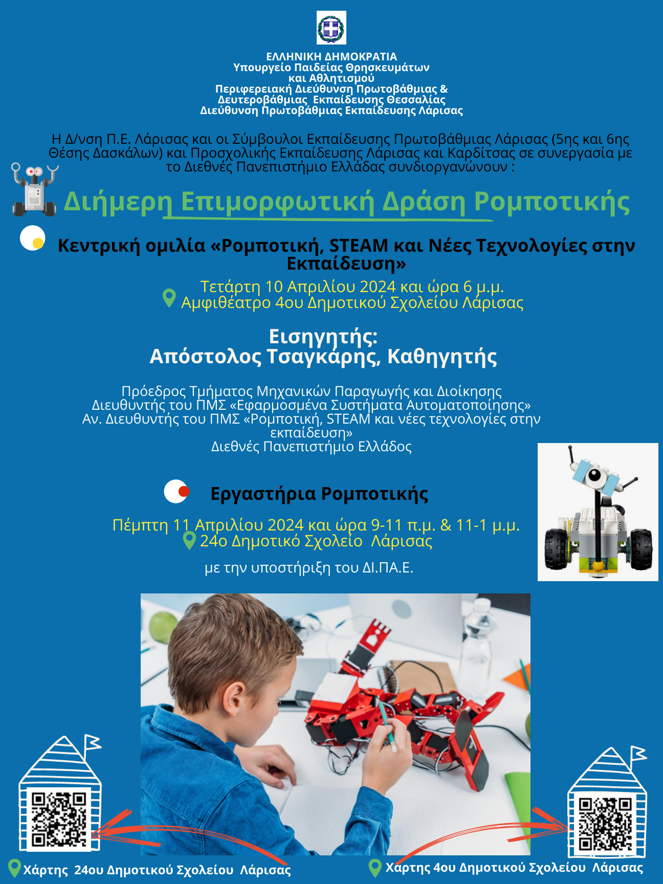 Η Δ/νση Π.Ε. Λάρισας και οι Σύμβουλοι Εκπαίδευσης Πρωτοβάθμιας Λάρισας (5ης και 6ης θέσης Δασκάλων) και Προσχολικής Εκπαίδευσης Λάρισας και Καρδιτσας σε συνεργασία με το Διεθνές Πανεπιστήμιο Ελλάδας συνδιοργανώνουν Διήμερη Επιμορφωτική Δράση Ρομποτικής με θέμα “Ρομποτική, Steam και Νέες Τεχνολογίες στην Εκπαίδευση”