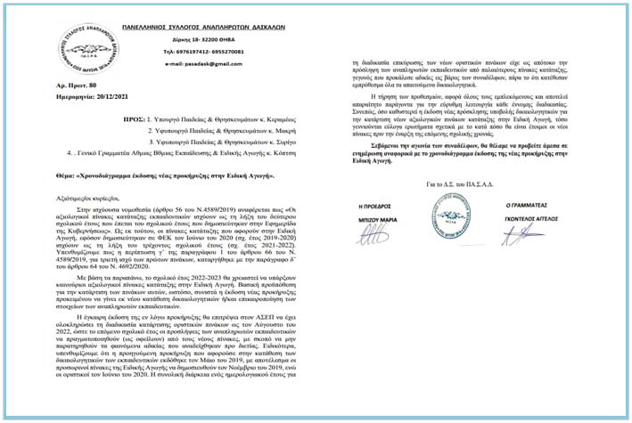 Ειδικότερα, όπως αναφέρουν στην επιστολή οι πίνακες κατάταξης της Ειδικής Αγωγής που δημοσιεύτηκαν σε ΦΕΚ τον Ιούνιο του 2020 ισχύουν έως τη λήξη του τρέχοντος έτους. Για τον λόγο αυτό το σχολικό έτος 2022-2023 θα χρειαστεί να υπάρξουν καινούργιοι αξιολογικοί πίνακες κατάταξης στην Ειδική Αγωγή και βασική προϋπόθεση για την κατάρτιση τους αποτελεί η έγκαιρη έκδοση νέα προκήρυξης προκειμένου να γίνει εκ νέου κατάθεση δικαιολογητικών ή/και επικαιροποίηση των στοιχείων των αναπληρωτών εκπαιδευτικών.