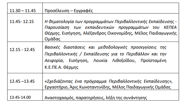 Το Κέντρο Εκπαίδευσης για το Περιβάλλον και την Αειφορία Θέρμης σε συνεργασία με τις Διευθύνσεις Πρωτοβάθμιας και Δευτεροβάθμιας Εκπαίδευσης Ανατολικής και Δυτικής Θεσσαλονίκης (δια των Υπευθύνων Περιβαλλοντικής Εκπαίδευσης) και το Δήμο Θέρμης καλεί τις/ τους εκπαιδευτικούς της Θεσσαλονίκης που δραστηριοποιούνται στο χώρο της Περιβαλλοντικής Εκπαίδευσης σε ημερήσια επιμορφωτική συνάντηση την Κυριακή 22 Σεπτεμβρίου 2024 στις 11:30-14:00 με θέμα “Εισαγωγική επιμόρφωση στην Περιβαλλοντική Εκπαίδευση”.