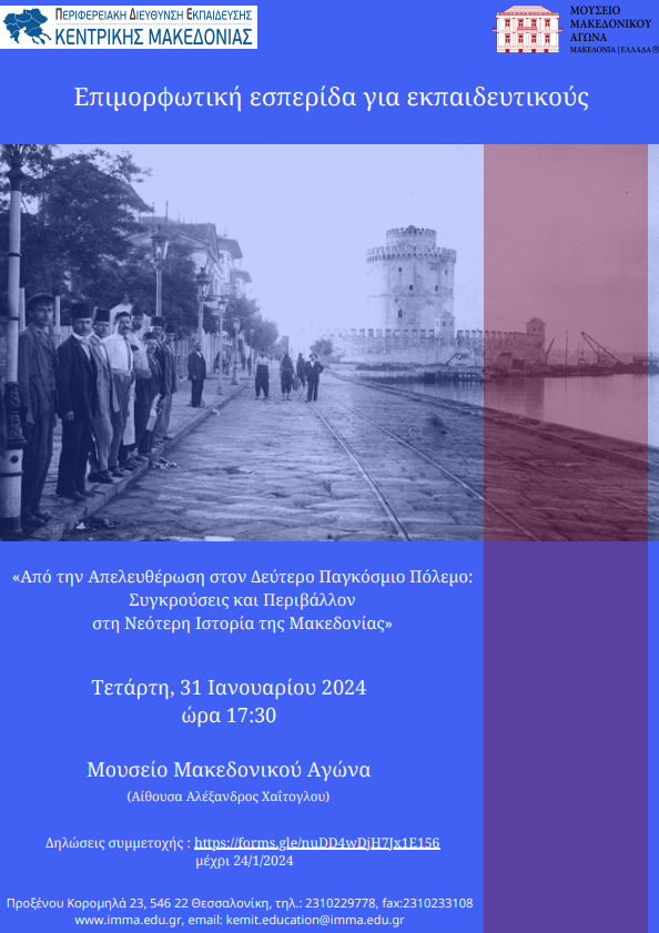 Επιμορφωτική εσπερίδα για εκπαιδευτικούς όλων των βαθμίδων με θέμα «Από την Απελευθέρωση στον Δεύτερο Παγκόσμιο Πόλεμο: Συγκρούσεις και Περιβάλλον στη Νεότερη Ιστορία της Μακεδονίας»