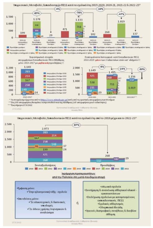Έντεχνη η αποφυγή του εξορθολογισμού των οργανικών κενών ! Καθημερινά αναρωτιόμαστε τι κρύβεται πίσω από την προσπάθεια αφανισμού του μαθήματος της Φυσικής Αγωγής και κατ΄ επέκταση του ρόλου των καθηγητών Φυσικής Αγωγής στην εκπαίδευση. Μετά από τα χρόνια της Πανδημίας και μετά από τις αμέτρητες μελέτες που αποδεικνύουν την σημαντικότητα της άσκησης, αφήνουμε τα παιδιά στα σχολεία μας χωρίς καθηγητές Φυσικής Αγωγής (πέρυσι υπήρχαν σχολεία που έμειναν ολόκληρη τη χρονιά χωρίς Φυσική Αγωγή και άλλα που έκαναν αυτό το μάθημα με..…το δάσκαλο! θυμίζοντας άλλες εποχές). Σήμερα, που θα έπρεπε να επανορθώσουμε τη ζημιά της μακροχρόνιας αδράνειας, δεν αντικαθιστώνται οι συνάδελφοι που αποχωρούν από την εκπαίδευση λόγω συνταξιοδότησης και τα κενά που αφήνουν, όχι μόνο δεν καλύπτονται, αλλά κρύβονται κάτω από το χαλί! Τα στοιχεία είναι συνταραχτικά και αναδεικνύουν την τραγική πραγματικότητα. Όπως θα διαπιστώσετε, υπάρχει τεράστια δυσαναλογία αποχωρήσεων και προσλήψεων στον κλάδο ΠΕ11 – Φυσικής Αγωγής. Τα γραφήματα που σας παραθέτουμε είναι αδιάσειστα στοιχεία για την αδικία που υφίσταται ο κλάδος μας διαχρονικά στους διορισμούς, με ιδιαίτερη έμφαση, στα δύο το τελευταία χρόνια. Ο αριθμός 1.019 στην Α’ φάση προσλήψεων των αναπληρωτών εκπαιδευτικών, αποκάλυψε ότι υπάρχει μεγάλη ανάγκη για μόνιμους διορισμούς σε σύγκριση με τους 137 που έγιναν πριν από μόλις δύο εβδομάδες!