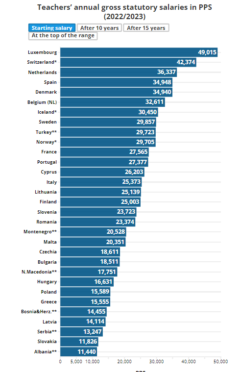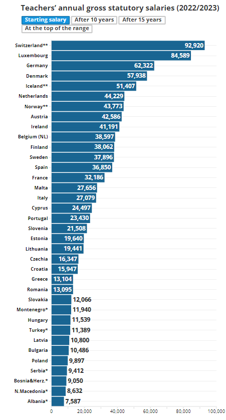 Σύμφωνα με το πρόγραμμα «Ευρυδίκη» της Ευρωπαϊκής Επιτροπής, οι ετήσιες ακαθάριστες νόμιμες αποδοχές για τους αρχάριους εκπαιδευτικούς το 2022/23 κυμαίνονταν από 9.897 ευρώ στην Πολωνία έως 84.589 ευρώ στο Λουξεμβούργο εντός της ΕΕ.