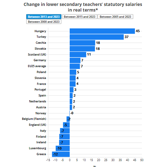 Μεταξύ του 2013 και του 2023, διαφαίνεται μια παρόμοια τάση. Η Ελλάδα βρέθηκε στην κορυφή της λίστας με τη μεγαλύτερη μείωση κατά 12%, ακολουθούμενη από το Λουξεμβούργο (10%) και την Ιρλανδία, τη Φινλανδία και την Ιταλία (7%). Στην Αγγλία, οι μισθοί των εκπαιδευτικών μειώθηκαν επίσης κατά 5% σε πραγματικούς όρους.
