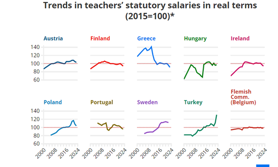 Αποτελεί έκπληξη αυτό το αποτέλεσμα; Όχι ακριβώς. Πρόκειται για ένα εξαιρετικά σύνθετο ζήτημα, ενώ παίζουν ρόλο πολλοί παράγοντες. Οι τάσεις των μισθών των εκπαιδευτικών σε πραγματικούς όρους προσφέρουν σημαντικές πληροφορίες. Τα τελευταία χρόνια και σε σχέση με τον πληθωρισμό, οι μισθοί των εκπαιδευτικών μειώνονται σε πολλές ευρωπαϊκές χώρες, όπως η Αγγλία, η Ιρλανδία, η Ιταλία, η Ελλάδα και η Φινλανδία.