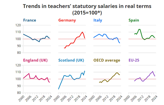 Τα γραμμικά διαγράμματα παραπάνω και παρακάτω απεικονίζουν ότι οι μισθοί των εκπαιδευτικών σε πραγματικούς όρους άρχισαν να μειώνονται σε πολλές χώρες μετά την πανδημία COVID-19. Η τάση αυτή είναι επίσης εμφανής στον μέσο όρο της ΕΕ-25.