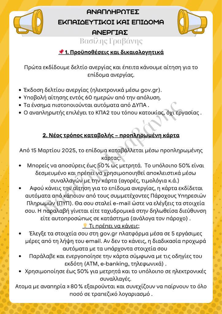 Για την έκδοση κάρτας ανεργίας των αναπληρωτών εκπαιδευτικών και μελών ΕΕΠ-ΕΒΠ, από τη Δημόσια Υπηρεσία Απασχόλησης ΔΥΠΑ, την υποβολή αίτησης για το επίδομα ανεργίας και τον νέο τρόπο καταβολής αυτού με προπληρωμένη κάρτα, ενημερώνει ο εκπαιδευτικός Βασίλης Γραβάνης.