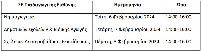 Ενημερωτική συνάντηση ΣΕ Παιδαγωγικής Ευθύνης Νηπιαγωγείων (6/2/2024, 14:00- 16:00) Σύνδεσμος: https://events.teams.microsoft.com/event/9d36e07d-c297-445f-acc2-b9c54ef55980@898c45e2-9ac0-48ce-9def-e9af5187ed3f
