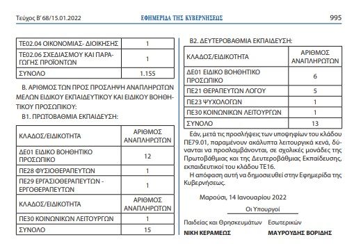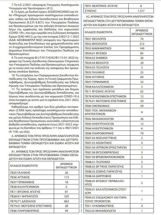 Δημοσιεύθηκε πλέον στην Εφημερίδα της Κυβέρνησης η Κοινή Υπουργική Απόφαση με την οποία καθορίζεται ο αριθμός των 2.500 προς πρόσληψη αναπληρωτών εκπαιδευτικών Α/θμιας και Β/θμιας εκπαίδευσης και μελών Ειδικού Εκπαιδευτικού Προσωπικού και Ειδικού Βοηθητικού Προσωπικού, ανά κλάδο, ειδικότητα και βαθμίδα Εκπαίδευσης, σχολικού έτους 2021-2022, σύμφωνα με τις διατάξεις του άρθρου 111 του ν. 4821/2021 (Α ́134).