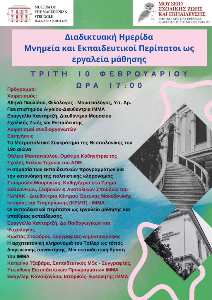 Το Μουσείο Σχολικής Ζωής και Εκπαίδευσης και το Μουσείο Μακεδονικού Αγώνα στα πλαίσια των Δικτύων «Ιστορίες μέσα από μνημεία: μαθαίνουμε την πολιτιστική μας κληρονομιά» και της Υπαίθριας Εκπαίδευσης την Τρίτη 10 Φεβρουαρίου ώρα 17:00 συνδιοργανώνουν διαδικτυακή Ημερίδα με τίτλο”Μνημεία και Εκπαιδευτικοί Περίπατοι ως εργαλεία μάθησης”
