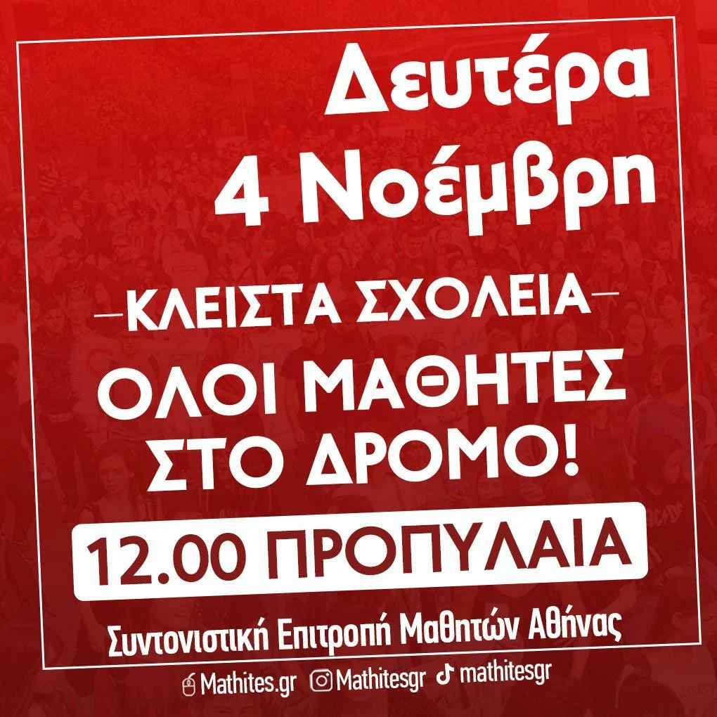 Η Συντονιστική Επιτροπή Μαθητών Αθήνας με σχετική της ανακοίνωση καλεί όλους τους μαθητές/τριες στους δρόμους στις 4 Νοέμβρη και ώρα 12:00 στα Προπύλαια.