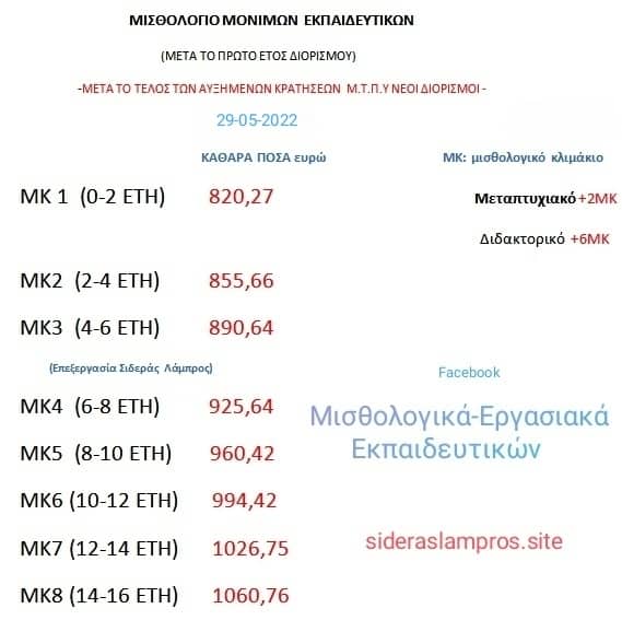 Στον πίνακα που ακολουθεί ο εκπαιδευτικός Λάμπρος Σιδεράς δίνει μια εικόνα για το μισθολόγιο των μoνίμων εκπαιδευτικών μετά το πρώτο έτος διορισμού.