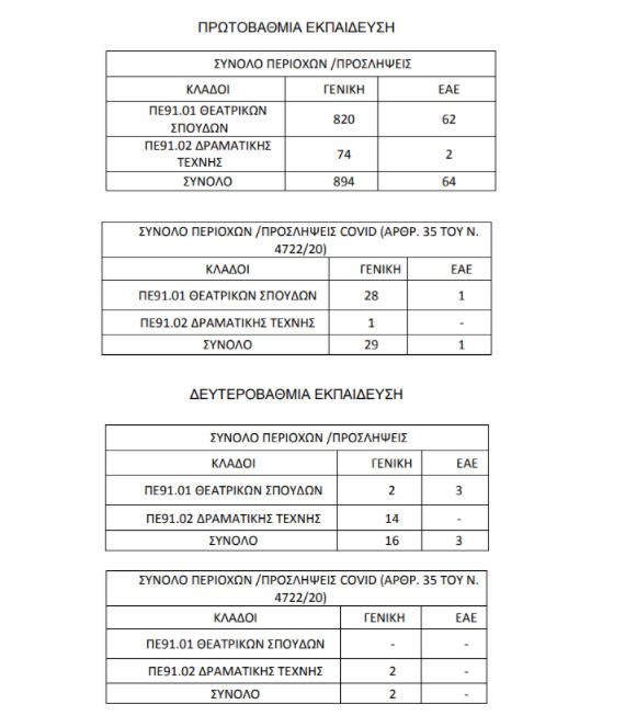Περαιτέρω, παρατίθενται πίνακες με τις συνολικές προσλήψεις αναπληρωτών για τις ειδικότητες ΠΕ91.01 Θεατρικών Σπουδών και ΠΕ91.02 Δραματικής Τέχνης, του κλάδου ΠΕ91-Θεατρικής Αγωγής, οι οποίες πραγματοποιήθηκαν μέχρι 5-3-2021 :