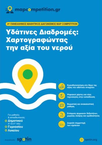 Ο 3ος Πανελλήνιος Μαθητικός Διαγωνισμός Map Competition έρχεται να αναδείξει τη ζωογόνο σημασία του νερού, αξιοποιώντας τη χρήση νέων τεχνολογιών και τη δύναμη των ψηφιακών χαρτών και της γεωχωρικής αφήγησης ως του πλέον αποτελεσματικού τρόπου απεικόνισης γεωχωρικής πληροφορίας.