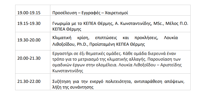 Το Κέντρο Εκπαίδευσης για το Περιβάλλον και την Αειφορία Θέρμης σε συνεργασία με τις Διευθύνσεις Πρωτοβάθμιας και Δευτεροβάθμιας Εκπαίδευσης Ανατολικής και Δυτικής Θεσσαλονίκης και Χαλκιδικής (δια των Υπευθύνων Περιβαλλοντικής Εκπαίδευσης), την Αντιδημαρχία Παιδείας, Αθλητισμού & Δια βίου μάθησης και την Αντιδημαρχία Πολιτισμού του Δήμου Θέρμης καλεί τις/ τους εκπαιδευτικούς της Θεσσαλονίκης και της Χαλκιδικής σε ημερίδα με θέμα «Το κλίμα αλλάζει. Εμείς;” την Δευτέρα 3 Ιουνίου 2024, στις 19:00-22:00 στη Δημοτική Βιβλιοθήκη – Πινακοθήκη Θέρμης.