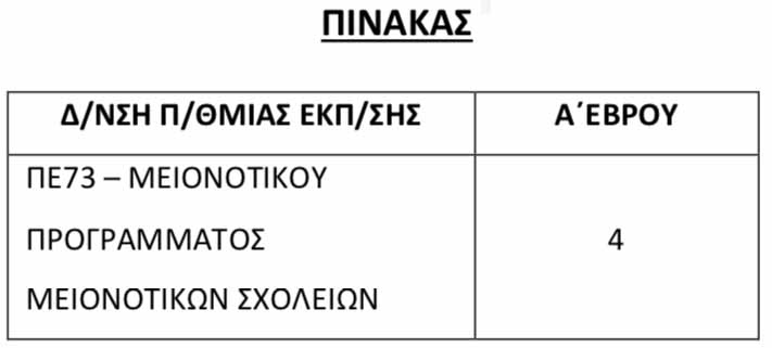 Η ΠΔΕ Ανατολικής Μακεδονίας Θράκης καλεί τους μόνιμους εκπαιδευτικούς Μειονοτικού Προγράμματος Μειονοτικών Σχολείων κλάδου ΠΕ 73 που υπηρετούν για το διδακτικό έτος 2024 – 2025 στη Διεύθυνσης Π/θμιας Εκπαίδευσης Ροδόπης, αρμοδιότητας της Περιφερειακής Διεύθυνσης Π/θμιας και Δ/θμιας Εκπαίδευσης Αν. Μακεδονίας – Θράκης και πλεονάζουν εξολοκλήρου, να υποβάλλουν, εφόσον το επιθυμούν, αίτηση απόσπασης στα αντίστοιχα λειτουργικά κενά, σύμφωνα με τα στοιχεία που παρατίθενται στον παρακάτω πίνακα: