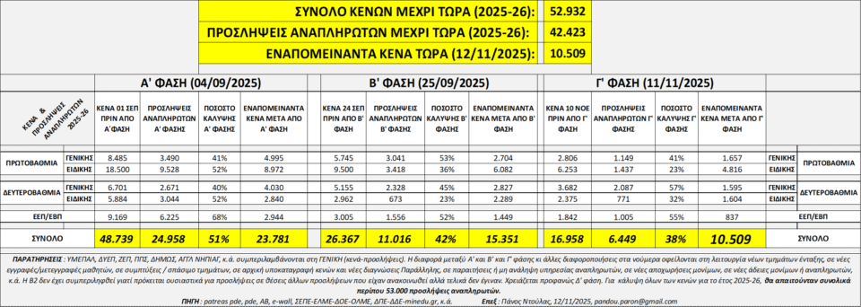 Τα κενά μετά την Γ Φάση: Πίνακες με τις προσλήψεις αναπληρωτών, το σύνολο κενών και τα εναπομείναντα έως σήμερα