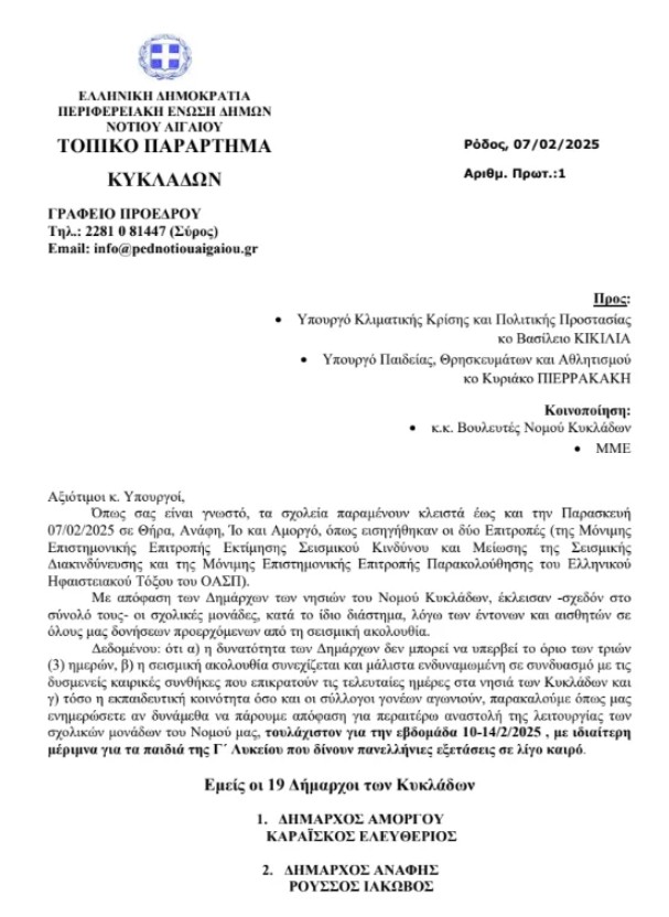 Παράταση αναστολής λειτουργίας των σχολικών μονάδων και  για την ερχόμενη εβδομάδα (10-14 Φεβρουαρίου) ζητούν οι δήμαρχοι των Κυκλάδων, από τα συναρμόδια υπουργεία  Παιδείας και Πολιτικής Προστασίας.