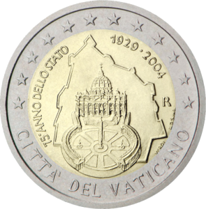 Το Βατικανό εξέδωσε αυτό το κέρμα για να γιορτάσει τα 75 χρόνια από την ίδρυσή του. Πρόκειται για ένα από τα πρώτα συλλεκτικά δίευρα που γνώρισαν μεγάλη ζήτηση. Παρότι δεν φτάνει τις αξίες των προηγούμενων, εξακολουθεί να θεωρείται πολύτιμο.