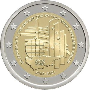 Το πιο πρόσφατο της λίστας! Εκδόθηκε από την Κύπρο το 2024, για να τιμήσει τη συμπλήρωση 10 ετών από την είσοδο της χώρας στην Ευρωπαϊκή Ένωση. Η περιορισμένη κυκλοφορία του, αλλά και το γεγονός ότι πρόκειται για σχετικά νέα κυκλοφορία, του δίνει αυξανόμενη αξία στη συλλεκτική αγορά.