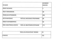 α) Συστήνονται, πλέον των υφιστάμενων, επτακόσιες είκοσι μία (721) οργανικές θέσεις εκπαιδευτικού προσωπικού πρωτοβάθμιας εκπαίδευσης, με μεταφορά ισάριθμων θέσεων από τη δευτεροβάθμια εκπαίδευση, στους κλάδους ΠΕ05 ΓΑΛΛΙΚΗΣ, ΠΕ07 ΓΕΡΜΑΝΙΚΗΣ, ΠΕ08 ΚΑΛΛΙΤΕΧΝΙΚΩΝ, ΠΕ86 ΠΛΗΡΟΦΟΡΙΚΗΣ και στους κλάδους/ειδικότητες ΠΕ79 ΜΟΥΣΙΚΗΣ: ΠΕ79.01 ΜΟΥΣΙΚΗΣ ΕΠΙΣΤΗΜΗΣ, ΠΕ91 ΘΕΑΤΡΙΚΗΣ ΑΓΩΓΗΣ: ΠΕ91.01 ΘΕΑΤΡΙΚΩΝ ΣΠΟΥΔΩΝ και ΠE91.02 ΔΡΑΜΑΤΙΚΗΣ ΤΕΧΝΗΣ, ως ακολούθως: