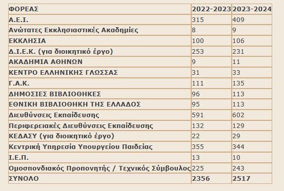 Με βάση τις αναρτήσεις από την ιστοσελίδα του Υπουργείου, οι αποσπάσεις στους κύριους φορείς έχουν ως εξής (μέχρι στιγμής για το 2023-2024):