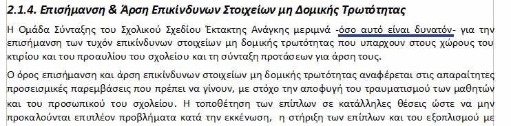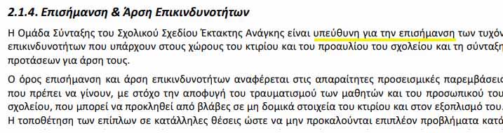 Η Ομάδα Σύνταξης του Σχολικού Σχεδίου Έκτακτης Ανάγκης είναι υπεύθυνη για την επισήμανση των τυχόν επικινδυνοτήτων που υπάρχουν στους χώρους του κτιρίου και του προαυλίου του σχολείου και τη σύνταξη προτάσεων για άρση τους.